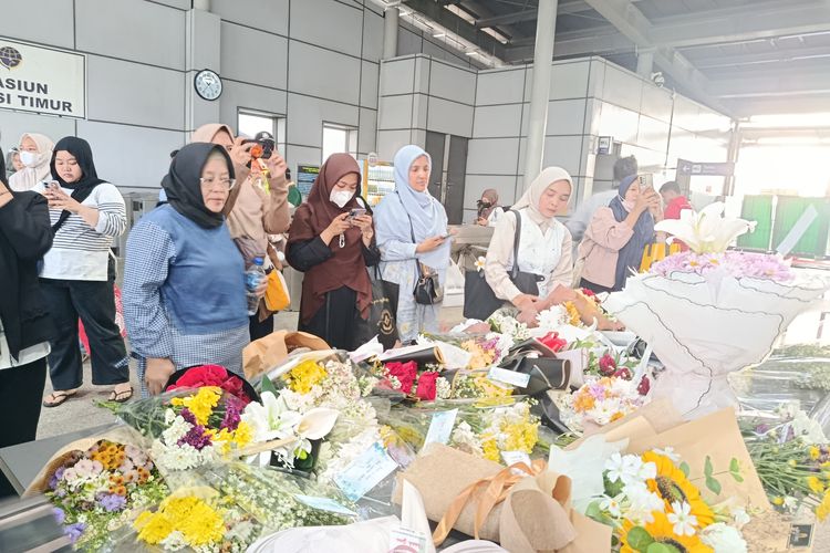 Di sudut peron, buket bunga berjajar memenuhi area Stasiun Bekasi Timur, disertai kertas berisi pesan duka dan doa bagi para korban.